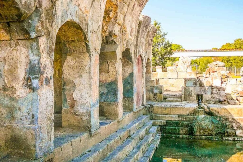 The Terme Libere di Fordongianus are small, open-air thermal pools that are free to use and generally accessible year-round, set along the Tirso River in the village of Fordongianus (Oristano, Sardinia). In Roman times, when the town was known as Forum Trajani, these waters were called Aquae Ypsytanae. The system historically included two springs—traditionally known as the “fegato” and the “bagno”: the Caddas spring, on the left bank of the Tirso, and the Banzos spring. Caddas is the main source, with a flow of about 43 liters per second and a temperature around 54°C, while Banzos has a much smaller flow (about 0.5 liters per second) and a temperature of roughly 44°C. The springs are also accompanied by gas emissions rich in nitrogen, adding to the site’s distinctive natural character.